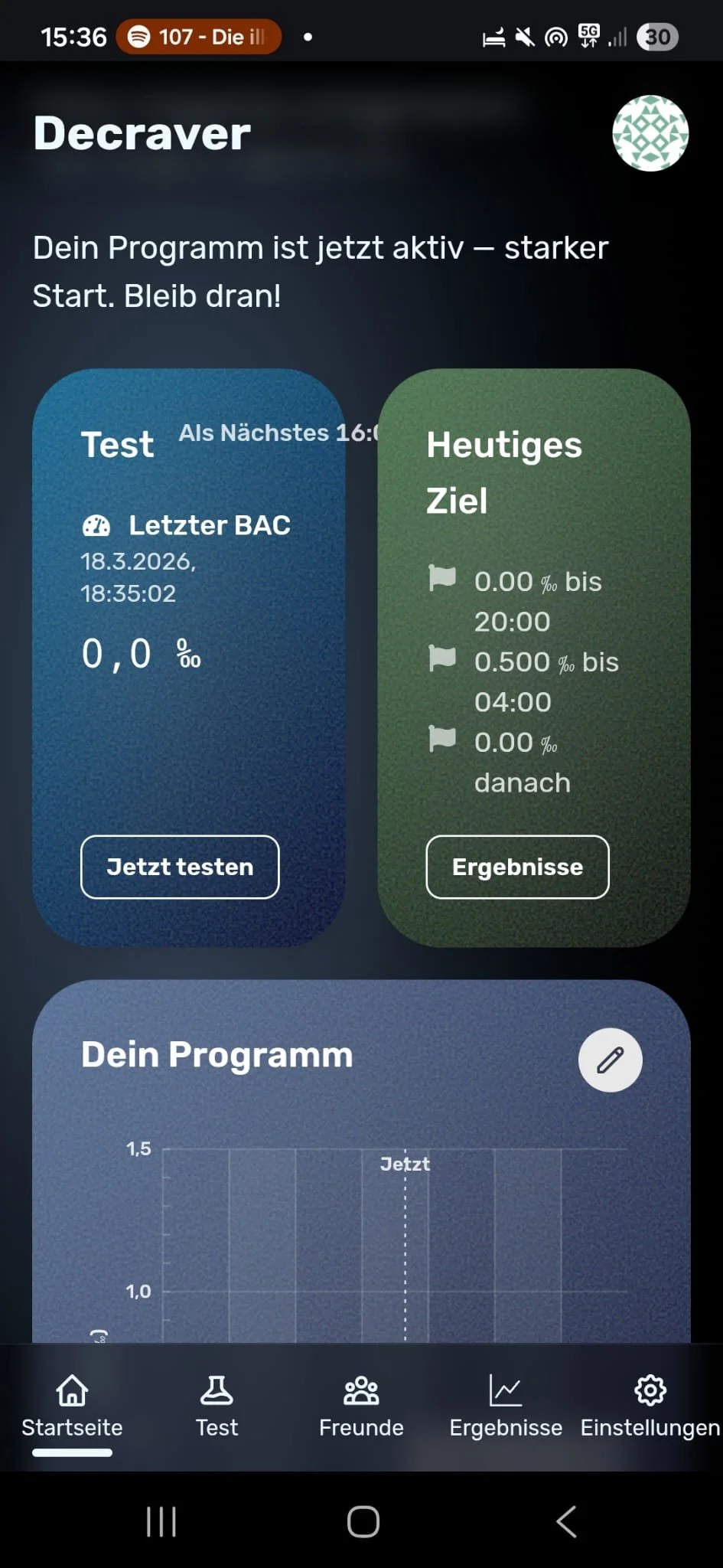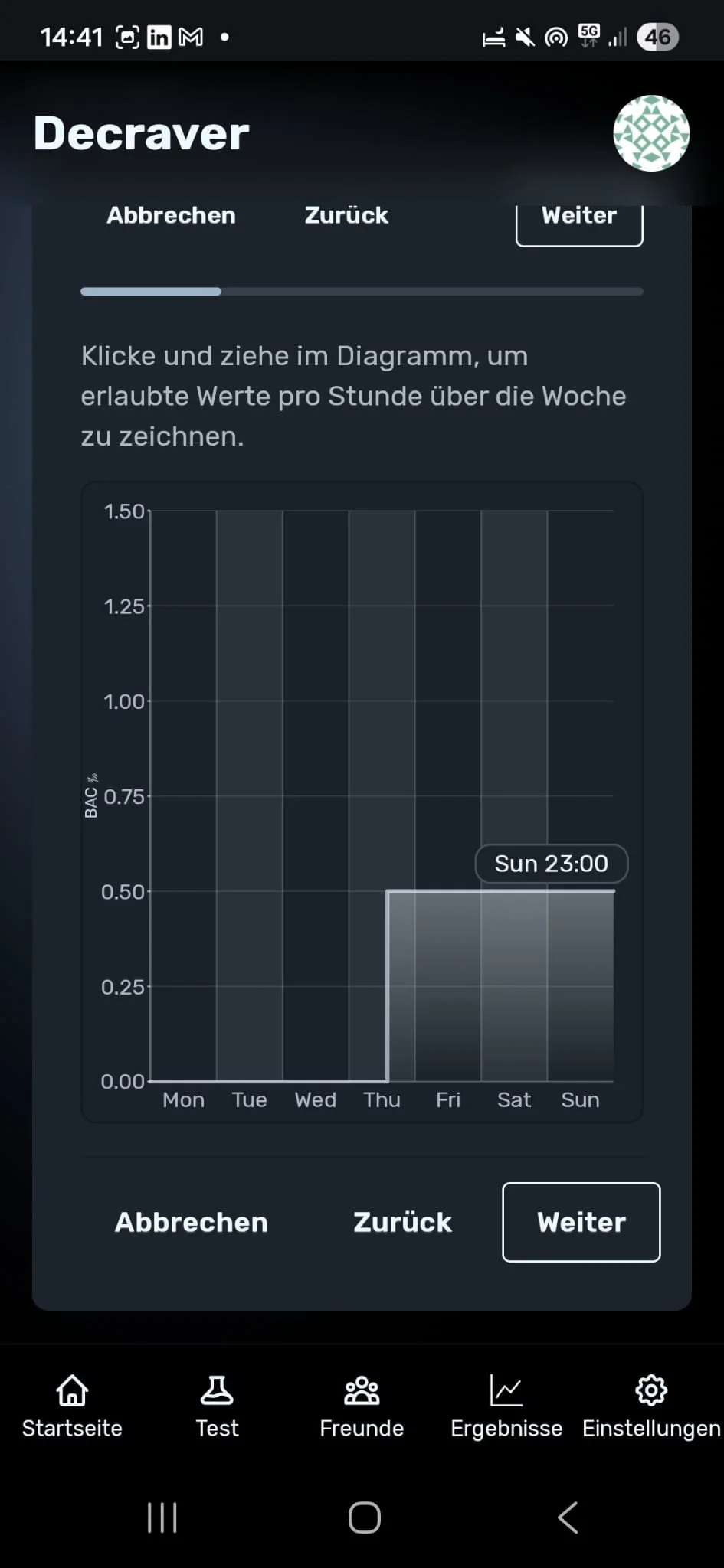 Du meldest dich auf der Decraver-App an und legst dein persönliches Programm fest: die alkoholfreien Tage, maximale Promillegrenze an Tagen, an denen du trinkst (z. B. 0.5 Promille), Uhrzeiten und Häufigkeit der Alkoholtests (z.B. 16:00, 20:00, 23:00).